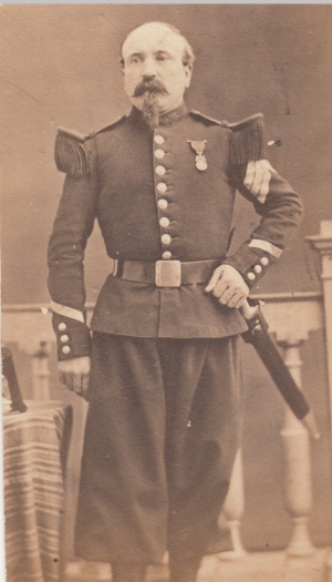 Le chef d'escadrons Fourchault, officier d'état major, pose dans une rare attitude belliqueuse. L'épée est à moitié sortie du fourreau, le regard est tourné vers un ennemi que l'objectif ne fixe pas et l'officier affecte une moue originale, peut être pour impressioner son adversaire inconnu. Distingué en Crimée et ayant servi avec honneur en Algérie durant de nombreuses années, sa pose n'est cependant pas exagérée. Son fait d'arme principal s'est déroulé durant l'expédition de Grande Kabylie (1857) où il a délivré 25 de nos soldats prisonniers des Kabyles et capturé dans les gorges de Tiroudla l'une des inspiractrices de la révolte : Lalla Fatma.