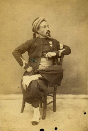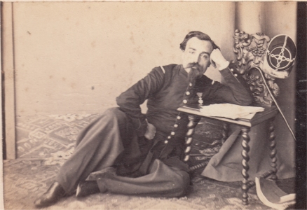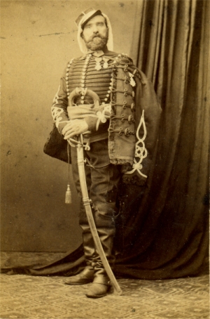 Le lieutenant Jules Marrot du 6e régiment de chasseurs à cheval pose alors qu'il sert en garnison en Algérie. Ayant servi en Algérie une première fois entre 1854 et 1856 (au 7e hussards), il pose devant l'objectif des photographes Plasse et Oberty lors de sa deuxième période passée en Algérie, cette fois au 6e régiment de chasseurs entre 1865 et 1869. Il est affublé d'un couvre nuque souvent porté en expédition en Algérie, mais aussi d'une paire de pistolets d'officier (modèle 1833) glissés à la ceinture et un beau sabre de cavalerie légère modèle an XI. Autre originalité, il porte deux croix de la légion d'honneur, l'une au dolman, l'autre à la pelisse, sans doute pour bien montrer cette décoration chèrement gagnée. Elle complète la médaille militaire, reçue en 1854 lorsqu'il était sous officier. La pose reste cependant assez traditionelle : l'homme est droit, face à l'objectif et les pieds sont joints.