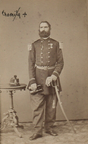 Pierre Joseph Chométy Né le 23/11/1827 à Tanninge en Savoie, Chométy a fait la première partie de sa carrière dans l'armée du royaume de Savoie et a participé à la campagne d'Italie. Il fait partie des officiers passés au service de la France lors du rattachement de sa patrie d'origine à la France en mars 1860. Il rejoint le 76e régiment d'infanterie en 1861 et y est promu Capitaine le 15/7/1870 au déclanchement de la guerre. Il se distingue à la bataille de Spicheren en supportant, avec sa compagnie, un long bombardement alors qu'il est en soutien d'une batterie française sous le feu ennemi. A Saint Privat, il combat avec le 2e bataillon. Il est fait prisonnier à la capitulation de Metz et interné en Allemagne à Burg ce qui nous offre cette belle photo dans le tenue qu'il portait lors de la campagne. Il est mort en mai 1873. Photo Sachse (Burg) |
