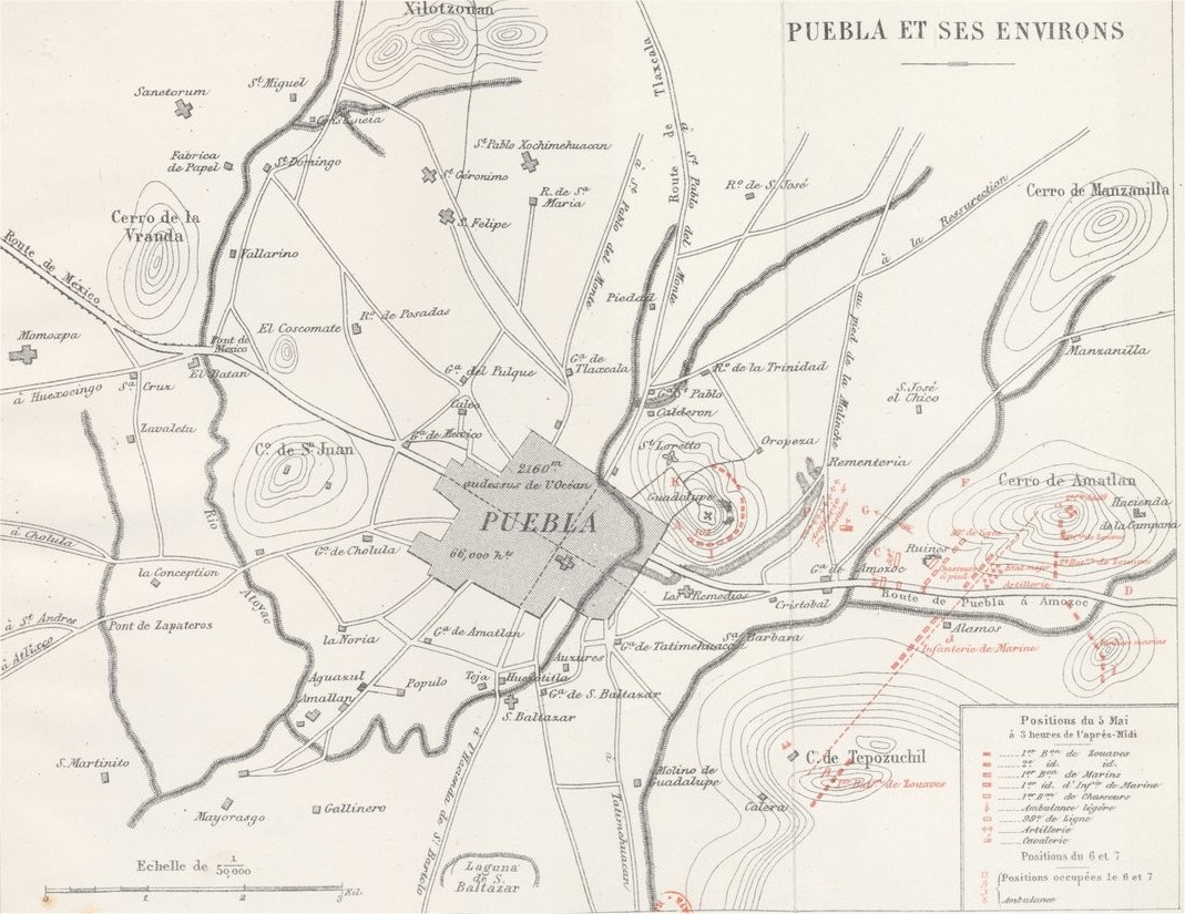 Cependant, le regard tourné vers la ville, le général semblait attendre l'effet de ces promesses tant de fois répétées depuis le jour de son débarquement. Vainement il cherche dans cette plaine devenue tout à coup silencieuse « l'enthousiasme de Puebla l'antijuariste », les « dix mille hommes de Marquez », qui auraient dû s'y trouver en même temps que lui ; et ce « grand parti de l'intervention», qui, depuis trois mois, lui était annoncé, chaque jour, pour le lendemain! Rien dans la plaine, rien sur la route. Soudain, retentit un coup de canon, un seul. Il est parti du fort de Guadalupe. A ce signal, qui est peut-être pour l'ennemi celui du combat, le général prend ses dispositions d'attaque.
