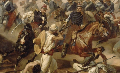 Horace Vernet (1789-1863) fut l'un des peintres militaires les plus connus, son succès le plus éclatant fut, lors de l'exposition universelle de 1855, d'occuper avec ses oeuvres une salle entière de l'exposition. Peu avant sa mort, il fut nommé Grand officier de la Légion d'Honneur par l'Empereur.