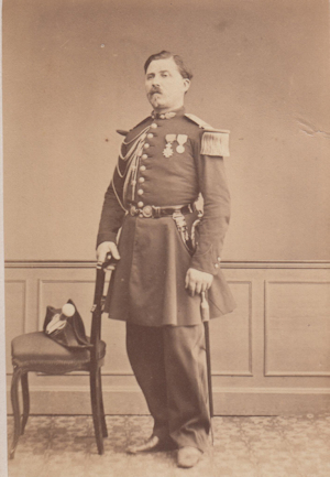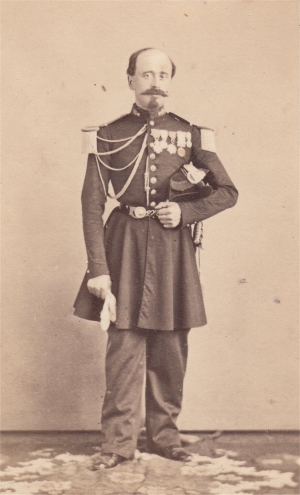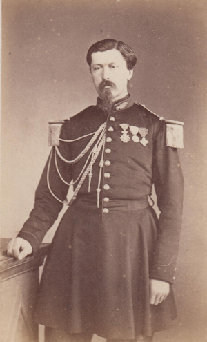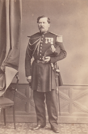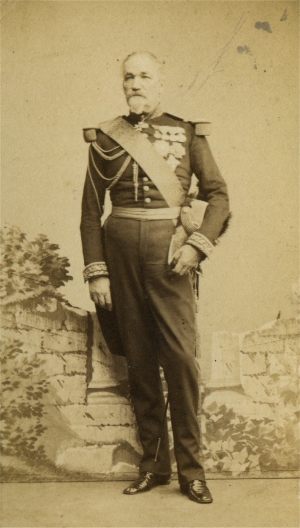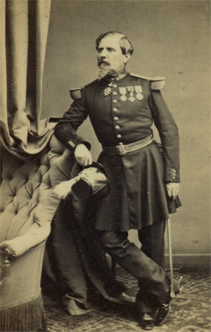 Jacques CAMOU, né le 1/5/1792 à Sarrance (Basses Pyrenées) Entré au service à 16 ans, il est sergent au 1er bataillon des chasseurs des montagnes le 6/9/1808. Il sert à l'armée d'Espagne en 1811, en Italie en 1813 et dans l'armée des Alpes en 1815. Fait prisonnier de guerre en 1813, il a reçu trois blessures dans la campagne d'Illyrie. sa carrière est momentanément interrompue après 1815, mais il reprend du service en 1817 comme Lieutenant dans la légion des basses Alpes. Il participe à la guerre d'Espagne en 1823 et à l'expédition d'Alger en 1830. C'est en Algérie qu'il va s'illustrer entre 1840 et 1854, notamment à Zaatcha le 26/11/1849 après un long siège. Nommé général de brigade en 1848, il est promu Général de division en 1852, commandant la division d'Alger. Il quitte alors l'Algérie pour prendre le commandement d'une division de l'armée d'Orient. Au cours du siège de Sébastopol, il est mis à la tête de la 2e division d'infanterie de la garde Impériale, qu'il commande encore en 1859 pour la guerre d'Italie. Grand Cordon de la Légion d'Honneur, il est nommé sénateur en 1863. Il est mort le 8/2/1868. |