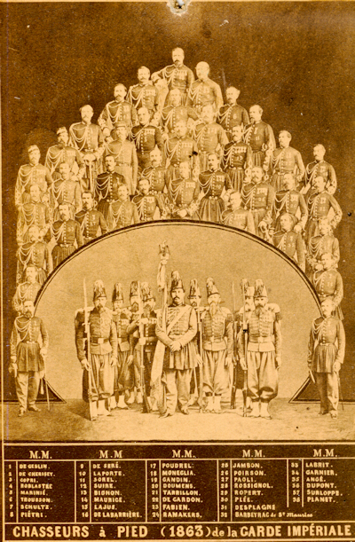 Sur toute la ligne la lutte grandissait. C'est à la baïonnette cette fois que les chasseurs combattent. Un détachement ennemi revient dans le village qu'il est surpris de trouver occupé. Pris entre deux feux, les Autrichiens sont tués ou faits prisonniers. Les capitaines Duval, Colonel, font de nouveaux efforts. Le lieutenant Mousset a la cuisse traversée. Cet officier intelligent succombe quelques jours après. Plus loin c'est une chapelle où l'ennemi retranché fait une résistance inutile. Ici des corps entiers se retirent en désordre où abandonnent armes et bagages ; rien ne les arrête plus dans leur fuite, pas même le drapeau du régiment que le chasseur Montellier leur arrache avec une ardeur qui va faire l'orgueil des chasseurs. En effet, ce trophée conquis à Solférino illustre à jamais le bataillon dont l'aigle, décoré de la croix de la Légion d'Honneur, portera bien haut la réputation des chasseurs à pied de la garde. Enfin les chasseurs apparaissent sur les hauteurs de Solferino, alors le combat cesse et la poursuite commence.