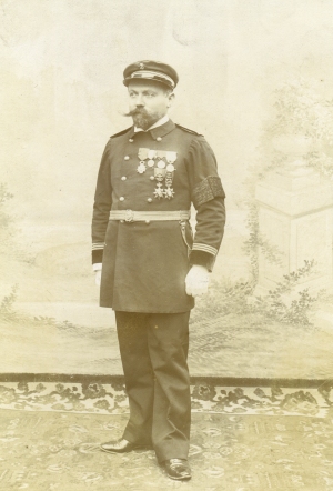 La grande tenue des officiers du corps du commissariat de la marine est caractérisée par des broderies en or sur velours brun loutre, figurant des feuilles de chêne et de vigne.