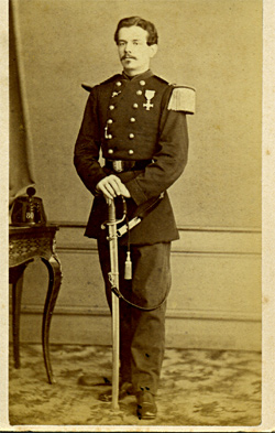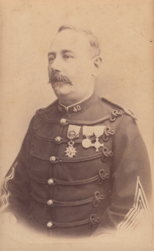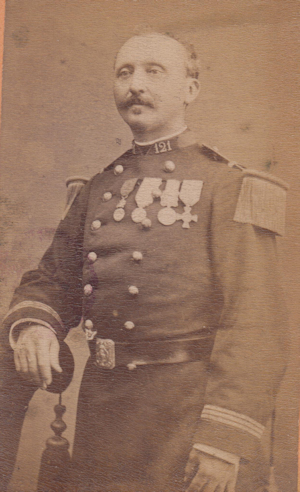 Charles Emile Sajous Né le 13/9/1834 à Bastia, fils d'officier, Charles Sajous rejoint le 80e régiment d'infanterie comme Sous Lieutenant à sa sorti de l'école de saint Cyr en 1856. Il a fait la campagne d'Italie et a servi en 1867 aux corps d'occupation de Rome (ce qui lui vaut la croix de Mentana). La guerre de 1870 le trouve Capitaine, grade qu'il détient depuis juin 1870. Durant la bataille du 18/8/1870, il est blessé à l'épaule droite par un eclat d'obus. Ses états de service mentionnenet cependant une contusion légère. Il finit sa carrière comme Lieutenant Colonel du 40e régiment d'infanterie (entre 1888 et 1892), officier de la Légion d'Honneur. Il est mort en 1902. Photo Courthial (Paris) |
