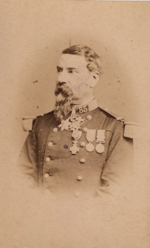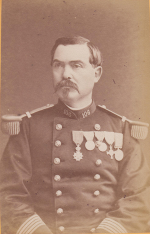 Philippe Baltazard Georges Raynal de Tissonnière Né le 6/9/1833 à Theylade (Cantal), ce Saint Cyrien (promotion 1852-1854) sert au 80e régiment d'infanterie depuis janvier 1855, faisant campagne en Orient, en Italie et au corps d'occupation de Rome. Capitaine depuis 1862, sa brillante conduite à Gravelotte lui vaut une promotion comme Chef de bataillon au régiment, le 24/8/1870. Capturé à la capitulation de Metz, il poursuit une brillante carrière, terminant général de division. Il est mort en 1905. Photo Chardonnet (Lyon)