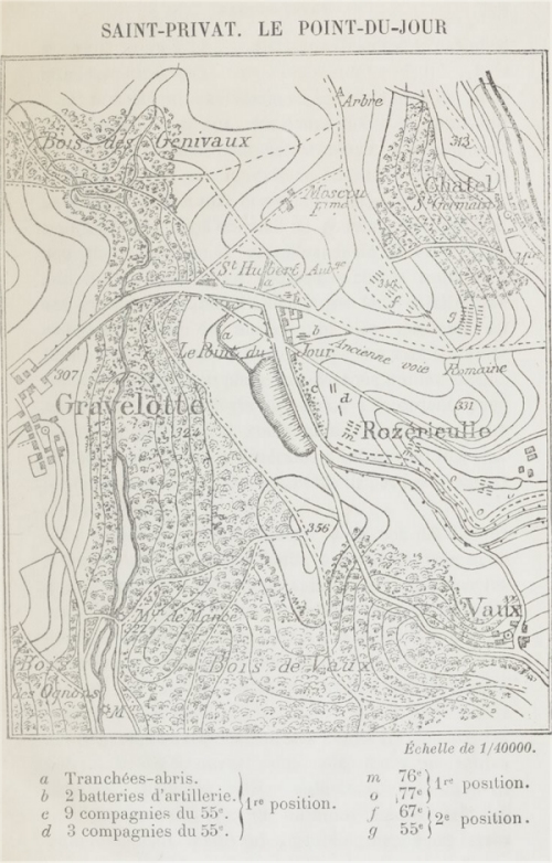 Quelques tirailleurs ennemis se déploient devant Gravelotte et disparaissent dans le ravin, ou se dirigent vers le bois des Génivaux, poussant devant eux les petits postes de la division de Castagny. Des batteries prennent place à gauche et à droite du village de Gravelotte; en arrière, sur la route qui va à Rezonville, d'épaisses colonnes paraissent immobiles et l'arme au pied.