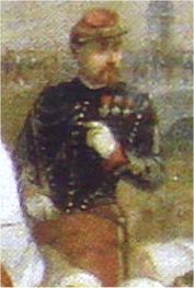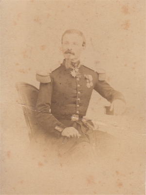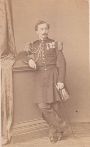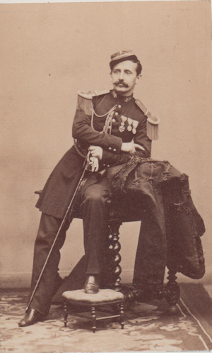 Augustin Henri le Mintier de Saint André Né le 27/9/1831 à Rennes, cet ancien élève de Saint Cyr (entre 1851 et 1853) est nommé Sous Lieutenant le 1/10/1853 au 11e régiment de chasseurs à cheval. Durant son année de formation à Saumur, il est muté au 8e régiment de Hussards le 28/9/1854. Il sert en Italie du 9/5/1859 au 1/2/1860 et y est promu Lieutenant le 31/10/1859. Le 4/8/1860, il est nommé officier d'ordonnance du général de Beaufort d'Hautpoul, commandant le corps expéditionnaire de Syrie et sert dans ses fonctions jusqu'au 3/7/1861. Il est ici photographié à Sedan, garnison du 8e Hussards entre 1865 et 1866, arborant ses déjà nombreuses décorations : la croix de la Légion d'Honneur (reçue après la Syrie le 12/8/1861), la médaille d'Italie et l'ordre militaire de Savoie (reçues en Italie) et le 5e classe du Medjidié, reçu lui aussi à la suite de la campagne de Syrie. Nommé Capitaine le 12/3/1866, il fait campagne en Algérie du 21/12/1869, jusqu'à sa démission de l'armée, le 28/1/1870, date de son mariage avec Berthe du Poulpiquet du Halgouet. Il reprend du service durant la guerre de 70 à la garde nationale mobile d'Ile et Vilaine, comme capitaine de la 5e compagnie du 4e bataillon et y sert au siège de Paris. Elu Chef du bataillon le 14/11/1870, il est blessé d'un coup de feu à l'épaule gauche lors de la bataille de Champigny le 2/12/1870 et reçoit la croix d'officier de la Légion d'Honneur le 7/2/1871. Durant la guerre, son frère cadet est tué à Sedan. Après la guerre, il est nommé chef de corps du 75e régiment d'infanterie territoriale et il devient Maire de la commune de StThurial. Il y est mort le 28/11/1890. Photo Jacquard (Sedan) |