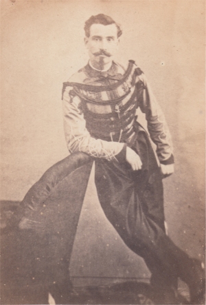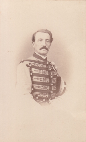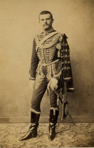 son entrée aux Guides de la Garde. Il porte sur ce cliché une tenue de gala avec culotte à la hongroise et bottes à la Souvarov. Passé au 1er régiment de carabiniers le 27/4/1859, il trouve la mort à Magenta le 4 juin en compagnie du général Espinasse dont il était officier d'ordonnance. "Pendant notre marche impétueuse sur Magenta, le général Espinasse avec le général de Castagny à ses côtés, tous deux l'épée à la main, s'étaient tenus en tête de la colonne. Arrivés au chemin de fer, les officiers généraux voulurent aborder à cheval l'entrée de la ville ; mais ne pouvant tenir sur ce sol mouvant de cadavres, Espinasse s'écria "Mettons pied à terre, on ne tient pas ici". Tous deux donnent leurs chevaux aux cavaliers d'escorte et Espinasse s'avance alors l'épée haute aux cris de "En avant !" . C'est pendant ce léger temps d'arrêt que l'extrême tête de colonne dépassant son chef valeureux se précipita dans la ville. Voyant les ravages portés dans nos rangs par une vaste maison surmontée d'un pavillon qui prenait des commandements sur tout le reste, Espinasse en montrant la porte s'écria "Enfoncez moi ça !" mais les efforts de nos hommes furent impuissants. La porte était solide et fortement barricadée de l'intérieur. "Si nous ne pouvons entrer par la porte, pénétrons par la fenêtre !" s'écria le général, et du pommeau de son épée il frappa à une persienne du rez de chaussée : un coup de feu partit : "je suis mort !" cria-t-il en étendant les bras, puis ayant tourné sur lui même, il tomba à la renverse. Froidefond, son officier d'ordonnance eut le même sort : presque au même instant une balle l'atteignit au bas ventre. Il poussa un cri épouvantable et roula dans la poussière." (Souvenirs du capitaine Faivre, aide de camp du général de Castagny). Photo Alophe (Paris) |
