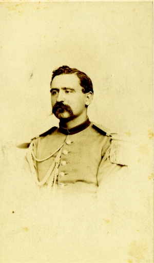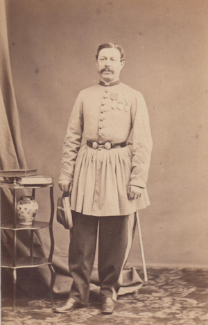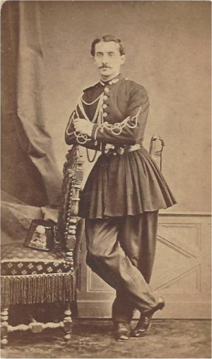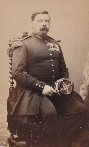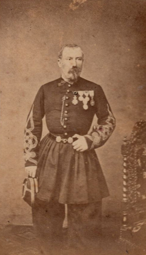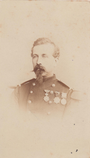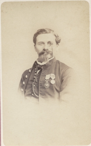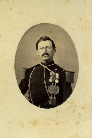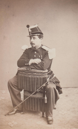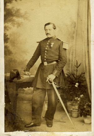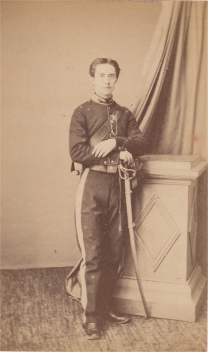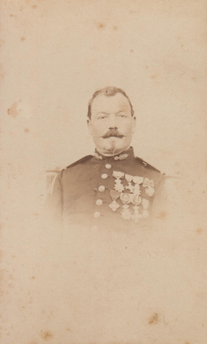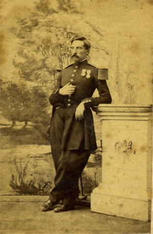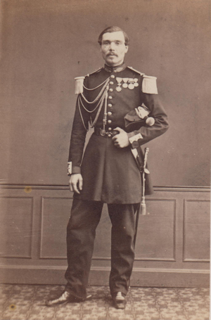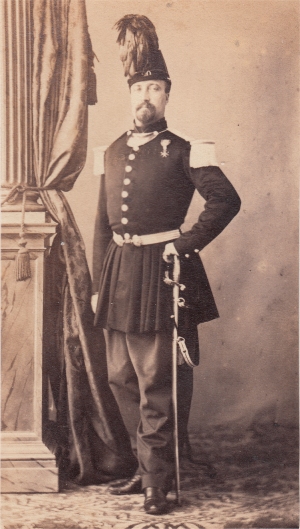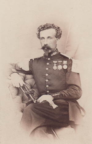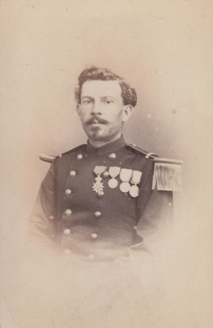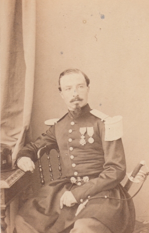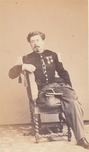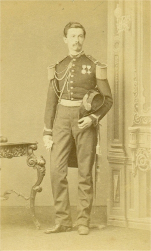 Né le 24/1/1838, Saint Cyrien de la promotion de l'Indoustan (1857/1859), il est nommé Sous Lieutenant le 1/10/1859, au 18e bataillon de chasseurs. Envoyé en campagne au Mexique, il est promu Lieutenant le 13/8/1865 et rejoint le 7e bataillon. Il est ici à droite photographié au Mexique à Guadalajara, peu de temps avant d'être décoré de l'ordre de Notre Dame de la Guadalupe, que l'on voit porté à gauche, de retour en France. Il est promu Capitaine le 10/8/1870 et