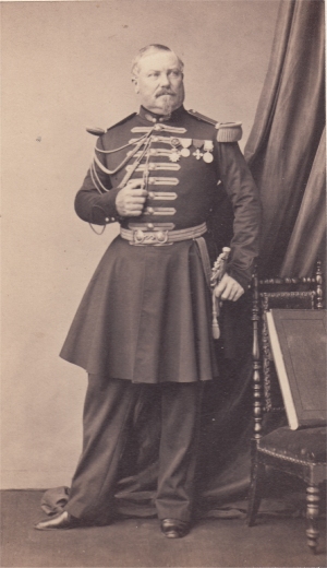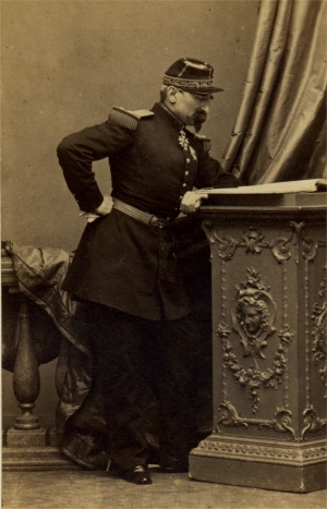 Né en Angleterre le 21/8/1812, ce Saint Cyrien de la promotion de 1830 a servi une dizaine d'années en Algérie où il a été cité plusieurs fois. Il a notamment été blessé deux fois, à Milianah en novembre 1839, puis à Medeah en avril 1841, alors qu'il servait au 17e régiment léger. Il a servi comme officier d'ordonnance du Duc d'Aumale lors de l'épisode de la prise de la Smala d'Abd El Kader. Colonel du 1er régiment léger entre 1848 et 1854, il est nommé officier de la Légion d'Honneur en 1850. Général de brigade en 1854, il a commandé durant sept mois une brigade en Crimée. Commandeur de la Légion d'Honneur depuis le 16/3/1860, en 1870, il commande la brigade composée des 25e et 26e régiment d'infanterie dans le 6e corps du maréchal Canrobert. Lors de la bataille de Rezonville, vers 17 heures, il conduit sa brigade sur la gauche du village de Rezonville pour attaquer une position occupée par une batterie de canons de 12 prussienne, mais la brigade doit reculer et subit d'importantes pertes. Le général Marguenat est tué pendant l'action. Photo Bertall (Paris) |