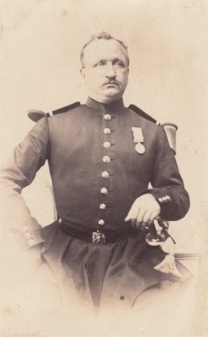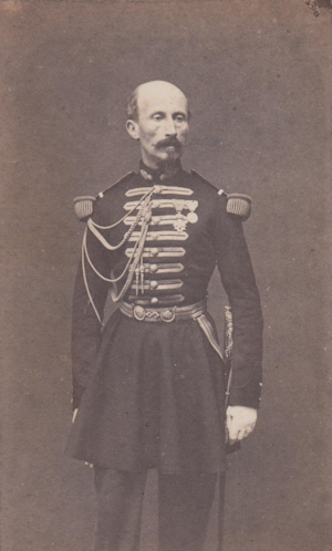 Dominique Manaud d'Aure Eleve de l'école de Saint Cyr (promotion de la nécessité), il est nommé Sous lieutenant au 2e régiment de chasseurs dans lequel il va faire toute sa carrière militaire. Lieutenant le 24/12/1846, puis Capitaine le 31/3/1851, il fait la campagne d'Italie et y est nommé chevalier de la légion d'honneur.En 1865, il se fait photographier alors qu'il est adjudant major du régiment. Ce grade, qu'il occupe depuis plus de dix ans, est reconnaissable à la teinte différente du galon central par rapport aux deux galons extérieurs. D'Aure arbore sa croix de la légion d'honneur, sa médaille commémorative d'Italie et l'ordre militaire du royaume de Savoie, tous reçus durant la campagne d'Italie. Il sera nommé Chef d'escadron le 13/8/1865, toujours au 2e chasseurs. En aout 1870, lors de la bataille de Rezonville, il est renversé de son cheval par un eclat d'obus d'artillerie. Il meurt à l'ambulance du château de Villers sous Bois le 18/8/1870 à 17h d'une plaie pénétrante à la poitrine. Photo Prévot (Paris) |
