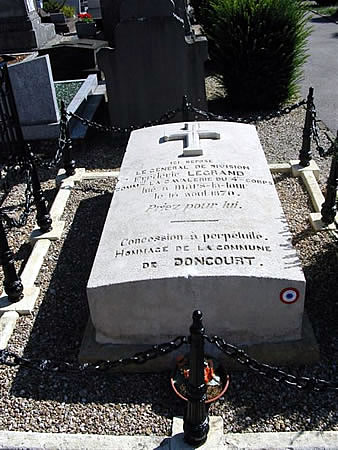 Alexandre Alphonse Legrand Né en mars 1849 à Jonville (Eure et Loir), Legrand a servi aux tirailleurs algériens , notamment en Crimée et en Cochinchine où il a reçu la croix de la Légion d'Honneur. Promu Capitaine le 21/1/1863, il a été nommé au 1er régiment des Grenadiers de la Garde quelques jours après le déclanchement de la guerre de 1870. Le 16/8/1870 à la bataille de Rezonville, le 1er Grenadier a deux bataillons déployés en tirailleurs sur la gauche de la route de Verdun, où ils arrètent la marche des colonnes prusiennes. Le 2e bataillon gagne même du terrain sur l'ennemi. Pendant 4 heures, la position est tenue sous un feu ecrasant. Les grenadiers, couché à plat ventre derrière leurs havresacs dont il se font un leger abri, font feu avec un calme digne des plus grands éloges, choisissant leur but et ne déchargeant leur armes qu'à bon escient. Dans cette journée, le régiment a deux officiers tués, dont le capitaine Legrand. (Francais et Allemands)". |