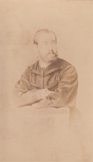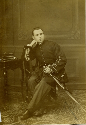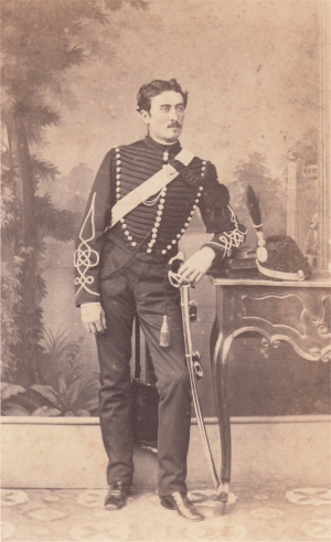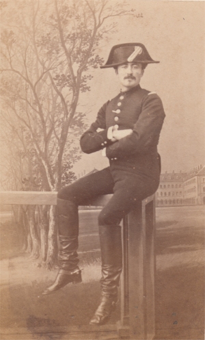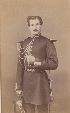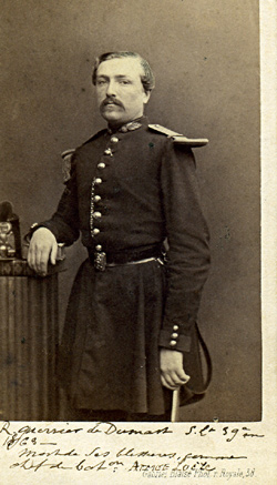 Fils d'un homme de lettre lorrain, il fait l'école de Saint Cyr entre 1855 et 1857 (promotion du Prince Impérial) et sort Sous lieutenant au 39e régiment d'infanterie. C'est dans ce grade qu'il se fait photographier dans l'uniforme d'officier de la période 1860-1868. Son début de carrière est assez lent, puisqu'il ne passe Lieutenant qu'en janvier 1865. Le 39e de ligne est en Algérie au début de la guerre de 1870 et il va contribuer à former le noyau des régiments mis sur pied pour former l'armée de la Loire. Guerrier de Dumast, alors Capitaine, s'y distingue et est nommé Chef de bataillon et officier de la légion d'honneur. Lors des opérations contre la Commune de Paris, il est blessé le 4 avril 1871 à la prise de la redoute de Chatillon d'un eclat d'obus au ventre. Il meurt le 18 avril 1871. |