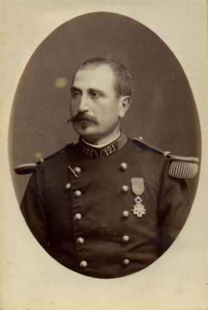 Marie Félicien René Martien Bernardy de Sigoyer Né le 29/8/1824 à Valence, cet officier sorti du rang a servi en Algérie, en Crimée et en Italie et a été blessé à deux reprises. Chef de bataillon à Thionville (photo ci contre), il a contribué à la défense de la Place lors du siège de 1870 et a de nouveau été blessé à deux reprises. Prisonnier, puis évadé, il est mis à la tête du 26e bataillon de chasseurs à pied en décembre 1870 et conduit cette troupe lors du second siège de Paris contre la Commune. Là, il se distingue lors des opérations militaires, mais surtout le 24 mai, en contribuant, par son initiative, à sauver le musée du Louvre des flammes de l'incendie allumé par les insurgés. Sa mort, deux jours plus tard, est relaté dans l'historique du 26e bataillon de chasseurs : "Le 26 mai, vers deux heures du matin le général Daguerre, commandant la brigade, fit appeler le commandant de Sigoyer, que l'on chercha vainement et que l'on ne put découvrir. On s'inquiéta, on fouilla les maisons voisines, on interrogea les soldats et les sentinelles. A minuit on avait vu le commandant se diriger seul vers la Bastille ; depuis lors il n'avait point reparu. A 9 heures, le corps du commandant de Sigoyer fut retrouvé près d'une maison incendiée entre le boulevard Beaumarchais et la rue Jean Beausire. Ce fut un cri de douleur parmi les hommes du bataillon qui adoraient leur commandant. Le commandant a dû être assassiné d'un coup de crosse de fusil, son cadavre est resté là même où il a été frappé ; les débris enflammés d'une maison l'ont couvert, lui ont carbonisé une partie du corps et l'ont mutilé de telle sorte que l'on a pu, jusqu'à un certain point, croire qu'un supplice atroce lui avait été infligé. Après avoir été tué, il fut dévalisé". Photo Roth (Thionville) |