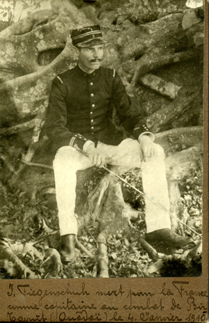 Jean Joseph Fiegenschuh Né le 19/09/1869 à Strabourg. Engagé volontaire au 2e régiment étranger le 19/3/1887, il est promu sergent en 1891. Naturalisé français en 1893, il rejoint l'école militaire d'infanterie en avril 1894 et est nommé sous lieutenant le 1/04/1895 au 3e régiment d'infanterie de marine. En juin 1896, il est nommé au régiment des tirailleurs annamites. Lieutenant le 1/04/1897. En avril 1898, il rejoint le 7e régiment d'infanterie de marine et y est nommé trésorier. En novémbre 1900, il passe au 13e régiment colonial à Madagascar et en 1902, rejoint les tirailleurs malgaches. En juin 1903, il rejoint l'Afrique. Promu Capitaine le 12/10/1903. Il est nommé chevalier de la Légion d'Honneur le 29/12/1903. .En 1905 il est au 3e tirailleurs malgaches à Madagascar, puis revient en France en 1906, au 1er régiment colonial. En 1909, il est au bataillon du Chari au Tchad et à la tête du cercle du Fitri. Le 1er juin 1909, à la tête d'une colonne de 180 tirailleurs et d'une section d'artillerie, il affronte 3000 ouadaïens et est blessé lors du combat. Cette victoire permet la capture d'Abéché. Le 17 fevrier 1910, le ministere des colonies publie le message suivant