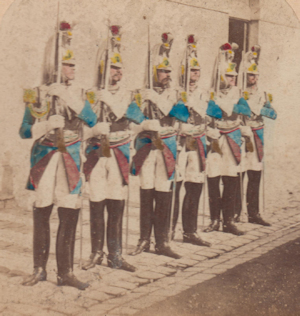 En 1870, les Cent-gardes partent en campagne sans cuirasses ni casques, portant la tunique et le chapeau ou le képi.