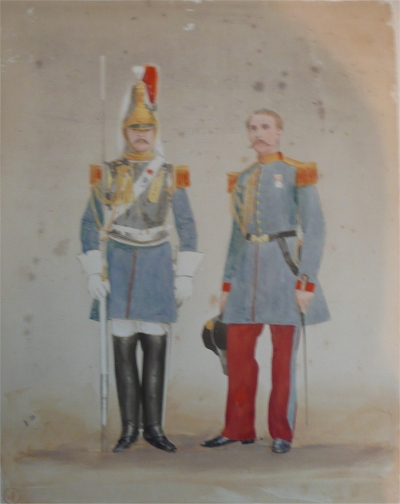 En petite tenue, la cuirasse n'est pas portée et la tunique est ornée des épaulettes et des aiguillettes. Le casque est remplacé par le chapeau bicorne. Pantalon garance, à double bande bleue.