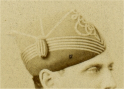 noir, avec une doublure en velour cramoisi. Les galons de grade sont en noeuds