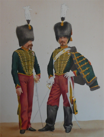La musique des Guides porte le dolman et la pelisse en drap écarlate, tresses jaune d'or, avec un galon argent au collet. Pantalon en drap vert foncé. La veste est en drap garance, à tresses jaunes, bordée de fourrure noire.