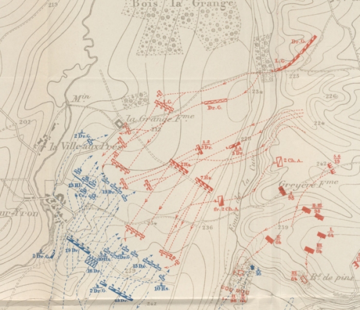 Lorsque je reçus l'ordre de partir avec mon régiment, un feu très vif se faisait entendre, entretenu par des cavaliers prussiens qui avaient poussé leur poursuite contre la cavalerie française jusque dans le village situé en arrière et à droite de notre position (?). Des hussards en assez grand nombre étaient chargés, sur les plateaux en avant de ce village, par des escadrons détachés de deux régiments de dragons et de cuirassiers de la Garde royale prussienne qui avaient pris position à l'autre extrémité de la plaine. Nous avons éprouvé assez de difficulté à traverser le profond ravin qui séparait notre position de celle des Prussiens. Lorsque j'arrivai sur le lieu du combat, je n'avais encore réussi qu'à rallier deux escadrons. Je lançai immédiatement l'escadron de droite en fourrageurs contre la charge prussienne que je pus prendre en flanc pendant que mon escadron de gauche servait, de base de ralliement à mon régiment. Dans cette charge en fourrageurs, nous avons tué pas mal de monde, et forcé l'ennemi à se retirer du village (?) et à cesser ses feux. Je fis sonner le ralliement lorsque tout le terrain fut dégagé. Je m'avançai alors avec le 4° dragons tout entier sur les deux régiments prussiens dont j'ai parlé plus haut.. Ils ne crurent pas devoir m'attendre, parce qu'à ce moment les régiments de la division commencèrent à se montrer sur les bords du plateau, ralliés par le général de division. Je me mettais en mesure de faire sonner la charge et de poursuivre, lorsque je fus arrêté par la sonnerie de l'état-major général.